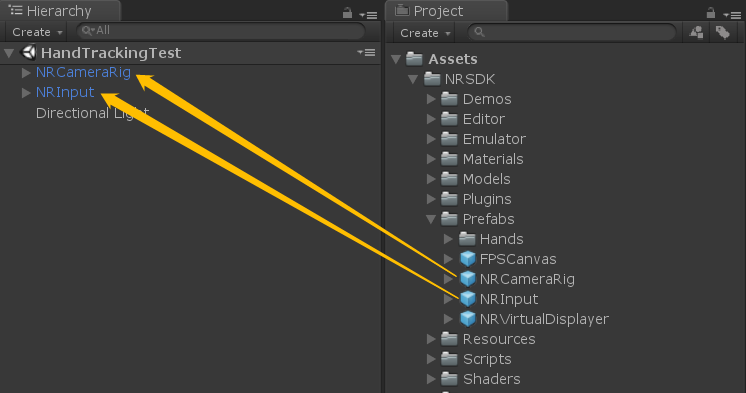 NRCameraRigandNRInputprefab fromAssets>NRSDK>Prefabs>NRCameraRig. Drag them to the scene hierarchy.