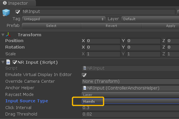 4. Select the NRInput GameObject in the Hierarchy window to open the Inspector window, and choose Hands as Input Source Type.