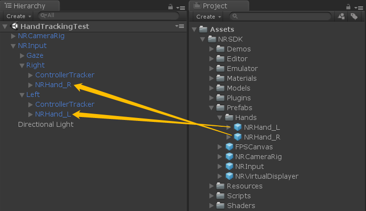 5. Find NRHand_R and NRHand_L from Assets>NRSDK>Prefabs>Hands. Add them as child GameObjects of Left and Right anchor in NRInput correspondingly.