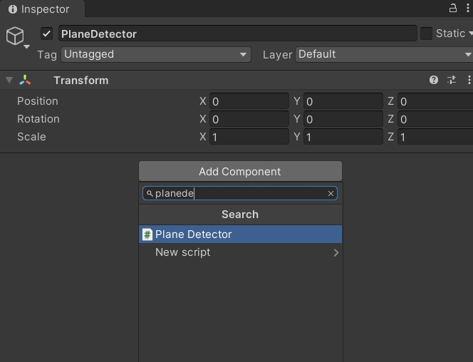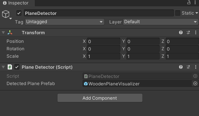 3. Select the new game object. Within the Inspector pane, click Add Component to add a PlaneDetector