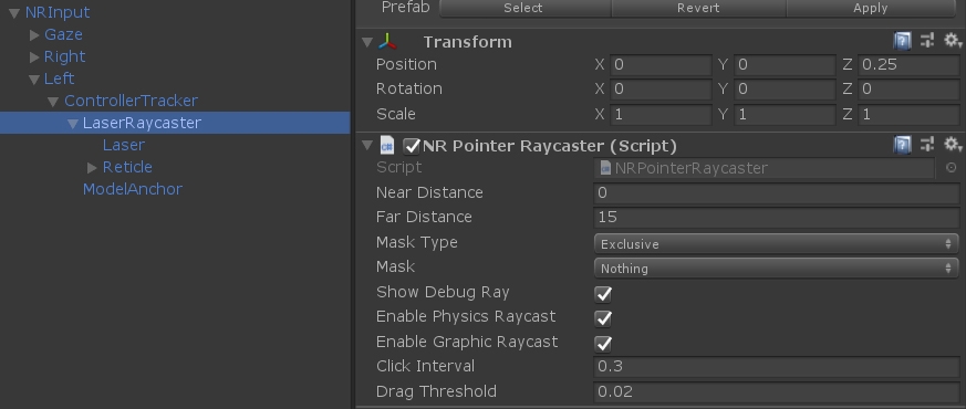 The raycaster class inherits from Unity's BaseRaycaster class. A chosen raycaster's farthest raycasting distance can be modified directly from the Inspector window. You can also define which objects are interactable by changing the parameter of their Mask.
